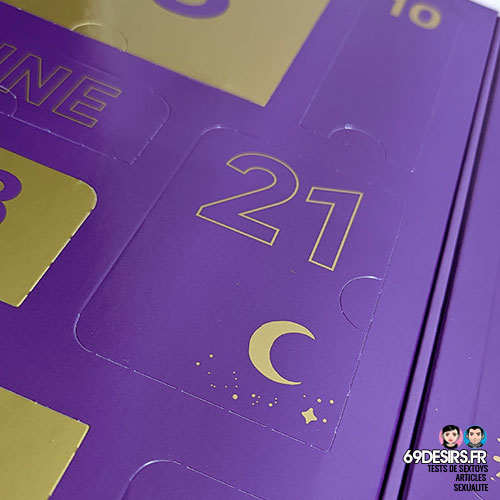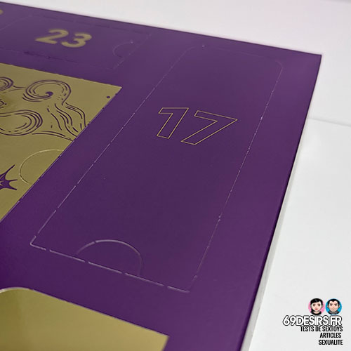 We also have a manual, which contains the list of products and some details about them. And there is also, a booklet of safety measures! We can also notice that the packaging of this Lovehoney x Womanizer advent calendar is 100% recyclable! The inner boxes are no longer made of plastic, but of cardboard and that’s a good thing. Inside, 24 boxes are present, some under a purple background, others under a golden background and with the date indicated in “number” and sometimes in “letter.