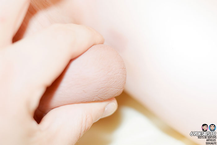 So even if the internal “oval mass” is harder than a real testicle, the whole is very realistic, much more than anything I’ve seen so far! The testicles are really interesting, you can manipulate them, take them with one hand, by squeezing them, you just have to see the pictures I made to realize it! During our tests, I played with the testicles, even licking them while Kitty bounced on Candice’s penis. They are really well done. The brownness of the testicles fades a bit over time. You can see this because when you first got there, one of the two testicles was a little stuck to one of the thighs, leaving a little brownish mark on it. Rest assured, this mark disappears with time.