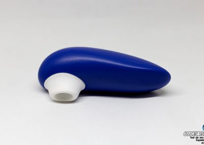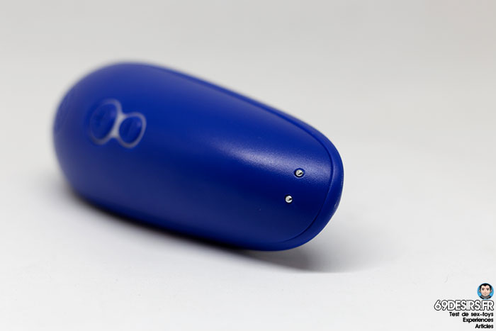 We also note that its shape is different, closer to a Womanizer Classic, but smaller. This is also a novelty, its more ergonomic shape while keeping a compact silhouette. There are two curved buttons, a “+” and “-” and the Womanizer logo on the top. Two magnetic points are also there to ensure the charge via the magnetic system. Of course, we find the stimulating tip delivering aspirations and pressure waves. The size of the tip is rather an average size.