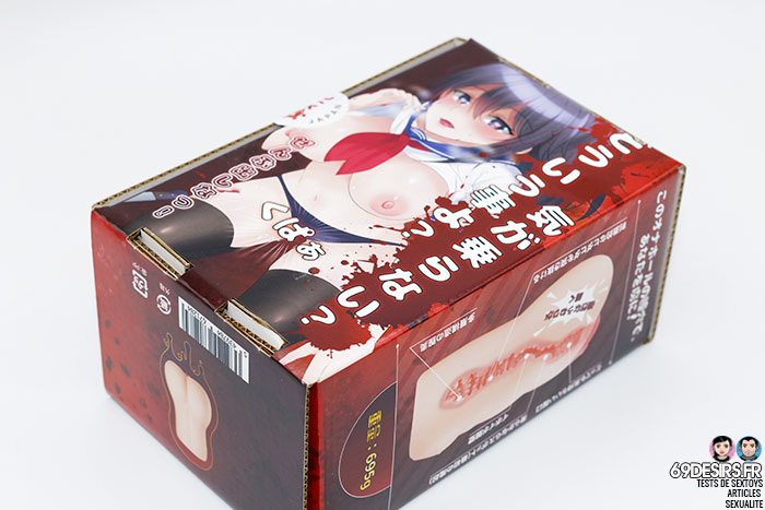 We find ourselves in a first time, with a box, typically Japanese! It is a small rectangular box, quite solid, where the red predominates on the rest. On the front, we can see a young woman, a schoolgirl, stained with blood, a knife in her hand! You understood it, she represents a “Yandere”. We can also see the front of the masturbator to discover what its orifice looks like.